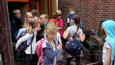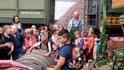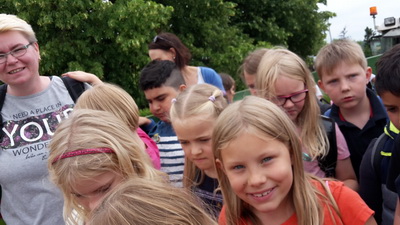 Bist du schon einmal Trecker gefahren? Wir schon, am 20.06.2018, zumindest im Anhänger. Mit viel Gekreisch ging es durch Felder und Wiesen. Damit uns nicht langweilig wurde und wir natürlich auch was lernen konnten, hielt Herr Schlensker zwischendurch immer wieder an und zeigte uns verschiedene Pflanzen. Hoffentlich können jetzt alle Gerste von Weizen und Hafer unterscheiden. Weißt du auch noch, woraus man Bier brauen kann? Während der Klatschmohn besonders hübsch aussah, duftete die Kamille sehr gut. Die Zuckerrübe müssen wir noch probieren. Auf dem Hof angekommen, begrüßten uns die Hunde überschwänglich. Dann hieß es erstmal auf der Wiese frühstücken. Das war auch gut so, denn nach dem Besuch im Schweinestall, hätten wir vielleicht nicht mehr essen mögen. Die Schweine sahen zartrosa und sauber aus. Gestunken hat es aber trotzdem. Ganz unruhig ging es im Hühnerstall zu. Das Gegacker nahm gar kein Ende und wie viel Eier die gelegt haben. Wahnsinn! Zum Schluss durften wir noch bei dem neugeborenen Alpaka vorbeischauen. Das sah vielleicht süß aus. Mit dem Trecker ging es wieder zurück zum Windrad und von dort gingen wir zur Schule zurück. Morgen wandern wir zur Freilichtbühne und am Freitag? Von uns aus, könnte es ruhig jeden Tag so weiter gehen.